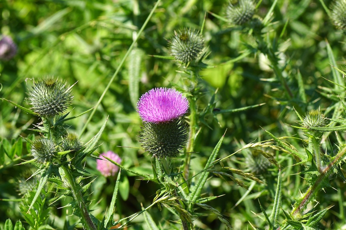 - Identification : Aussi appelé cirse commun, il peut atteindre 1 m de haut à l’état sauvage. Sa tige est épineuse, tout comme ses feuilles lobées qui forment une rosette. Ses fleurs pourprées, à la silhouette reconnaissable, s’épanouissent seules ou en grappes.